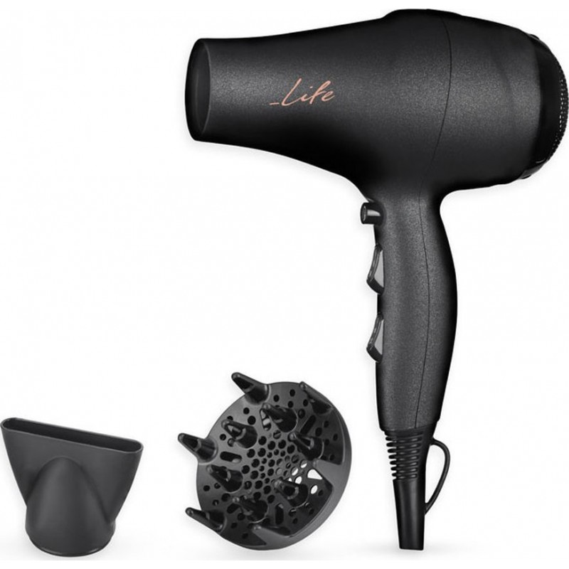 Το σεσουάρ LIFE HD-001 2000W με το κομψό design και το ιδιαίτερο ματ rubber φινίρισμα, αποτελεί ιδανική επιλογή για κάθε χρήστη. Το δυνατό μοτέρ των 2000W, δημιουργεί μία εξαιρετικά ισχυρή ροή αέρα κάνοντας το στέγνωμα και το φορμάρισμα των μαλλιών σας εύκολο και γρήγορο. Τα αποσπώμενα ακροφύσια καλύπτουν κάθε ανάγκη, καθώς περιλαμβάνονται στόμιο για ίσιωμα και φυσούνα για όγκο και μπούκλες. Η ταχύτητα και θερμότητα μπορούν να ρυθμιστούν με ευκολία για να δημιουργήσετε το επιθυμητό αποτέλεσμα. Επιλέξτε ανάμεσα στα 2 επίπεδα ταχύτητας και 3 επίπεδα θερμοκρασίας και χρησιμοποιήστε την λειτουργία cool shot για να σταθεροποιήσετε το styling μόλις ολοκληρώσετε. Τέλος, διαθέτει καλώδιο 1.8m για μέγιστη ευελιξία και είναι ιδιαίτερα ελαφρύ, 350gr, για άνετη και ξεκούραστη χρήση.