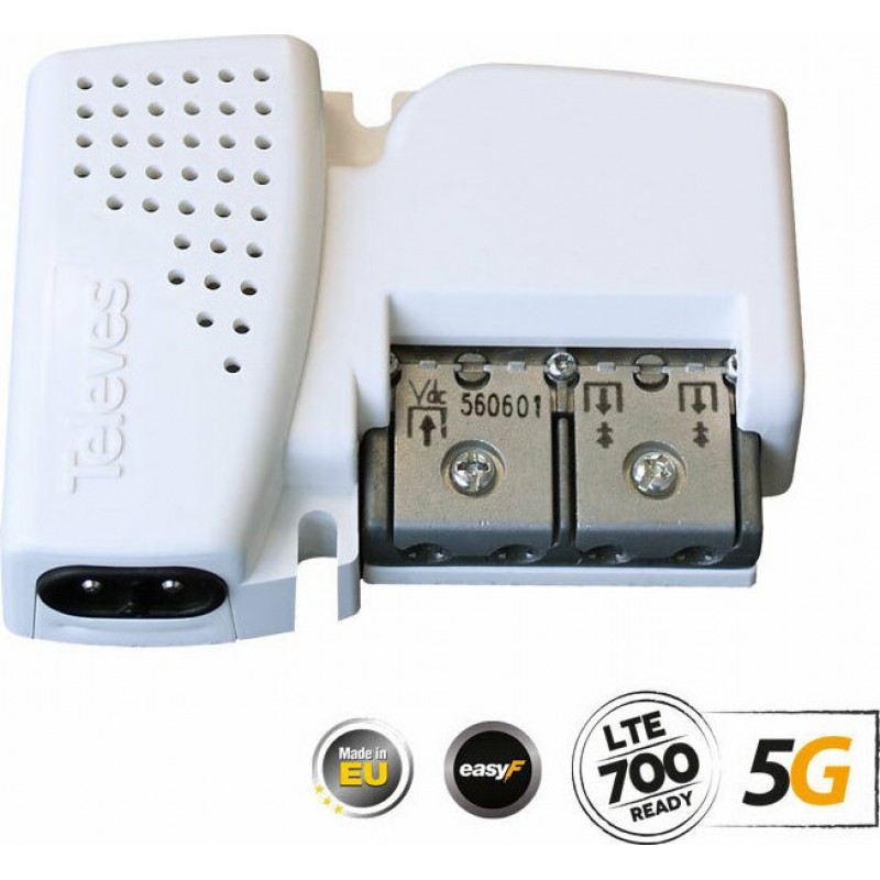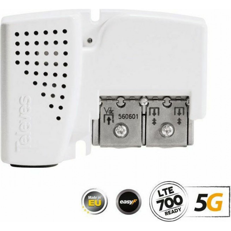 O εξαιρετικά προηγμένος ενισχυτής γραμμής TELEVES 560601 PicoKom ΕΝΙΣΧΥΤΗΣ ΓΡΑΜΜΗΣ AGC UHF/VHF/SAT 2out 5G LTE, προσφέρει λειτουργία Plug & Play για τις μπάντες UHF/VHF/FM και ΔΟΡΥΦΟΡΙΚΟ, μαζί με επιλογή ΕΝΙΣΧΥΤΗ ΔΟΡΥΦΟΡΙΚΟΥ σήματος (όταν ενεργοποιηθεί το DC OUT από τον διακόπτη στο πίσω μέρος). Διαθέτει συμπαγή και πολύ μικρών διαστάσεων κατασκευή, ενώ παρέχει ενίσχυση splitband στα VHF/UHF και διαθέτει ενσωματωμένο switching τροφοδοτικό. Σημαντικό χαρακτηριστικό του αποτελεί ο διακόπτης ON/OFF στην πίσω πλευρά, για ενεργοποίηση εξόδου τροφοδοσίας DC προς κεραίες Televes TForce BOSS, ενεργά δίπολα , κλπ, καθώς και για την ενεργοποίηση της ΕΝΙΣΧΥΣΗΣ ΔΟΡΥΦΟΡΙΚΟΥ ΣΗΜΑΤΟΣ, ενώ η λειτουργία Automatic Gain Control (AGC) στα UHF/VHF, συνεχώς επιβλέπει και αυτορυθμίζει το σήμα στις μπάντες αυτές, με σκοπό να παρέχει την βέλτιστη στάθμη σήματος προς τις τηλεοράσεις. Είναι κατασκευασμένος από κράμα Zamak για αντιδιαβρωτική προστασία και ηλεκτρομαγνητική θωράκιση. Διαθέτει συνδέσεις Εasy-F για γρήγορη, σίγουρη και εύκολη σύνδεση των καλωδίων, χωρίς την ανάγκη προσθήκης βυσμάτων. Διαθέτει έξοδο DC (on-off) για τροφοδοσία κεραιών Televes TFORCE B.O.S.S. ή προενισχυτών/ ενεργών διπόλων.
